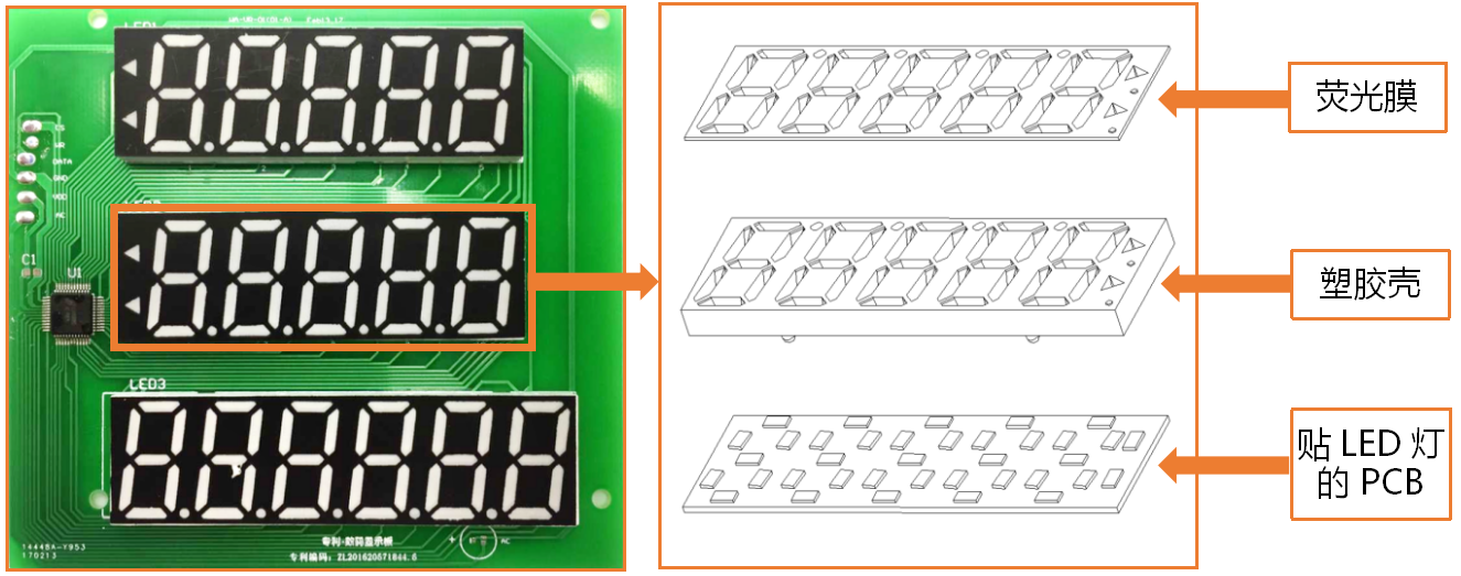如上图所示,左边为实际生产出来的显示板,右边为显示板5位数码显示内部结构。贴片发光二极管作为显示发光体,与塑料壳和荧光膜组成一个5位一体数码管。贴片二极管采用我们的专利发光二极管,以配合我们的驱动IC实现单面板走线。若有某段位的灯坏了,我们只需要把壳子取下来,换掉那个灯,即可修好。