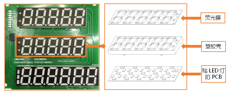 如上图所示,左边为实际生产出来的显示板,右边为显示板5位数码显示内部结构。贴片发光二极管作为显示发光体,与塑料壳和荧光膜组成一个5位一体数码管。贴片二极管采用我们的专利发光二极管,以配合我们的驱动IC实现单面板走线。如果有哪一个段位的灯坏了,我们只需要把壳子取下来,换掉那个灯,即可修好。