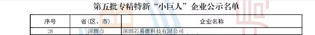 2023年7月14日,根据中华人民共和国工业和信息化部下发的《关于深圳市第五批专精特新“小巨人”企业名单的公示》,深圳芯易德科技有限公司被认定为第五批国家级专精特新“小巨人”企业。