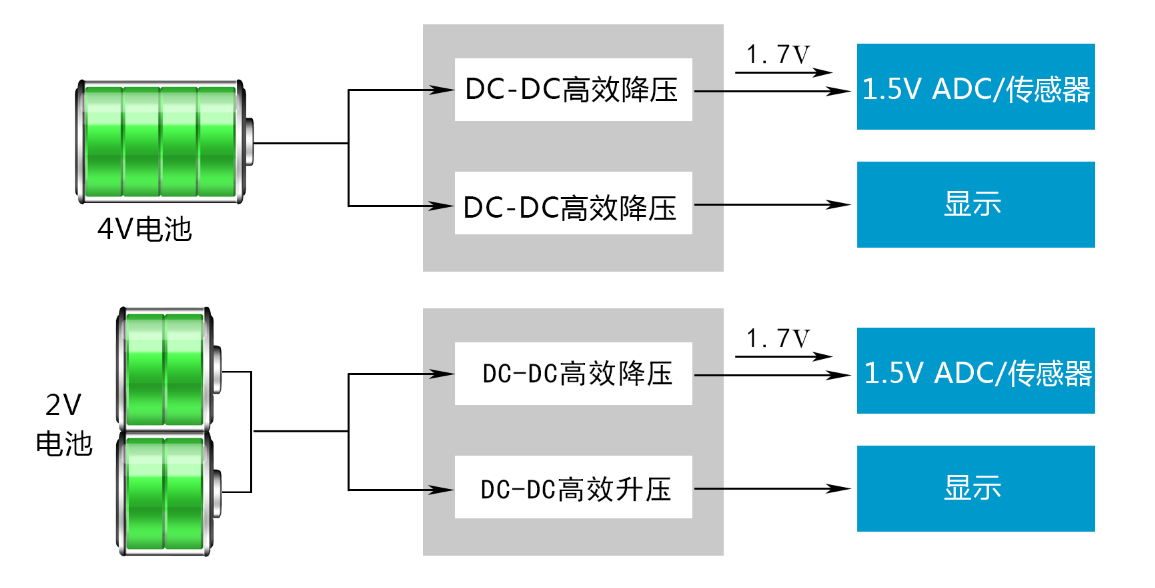 ● 将电池高效转化成1.7V电源供电(可简单的理解为将4V电池容量增大了不止1倍)