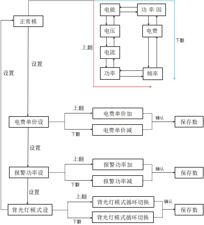 3、“下翻”键,在正常模式先用于循环切换显示界面,在设置电费单价模式下用于电费单价“-”,在设置报警功率模式下用于报警功率门限“-”。
